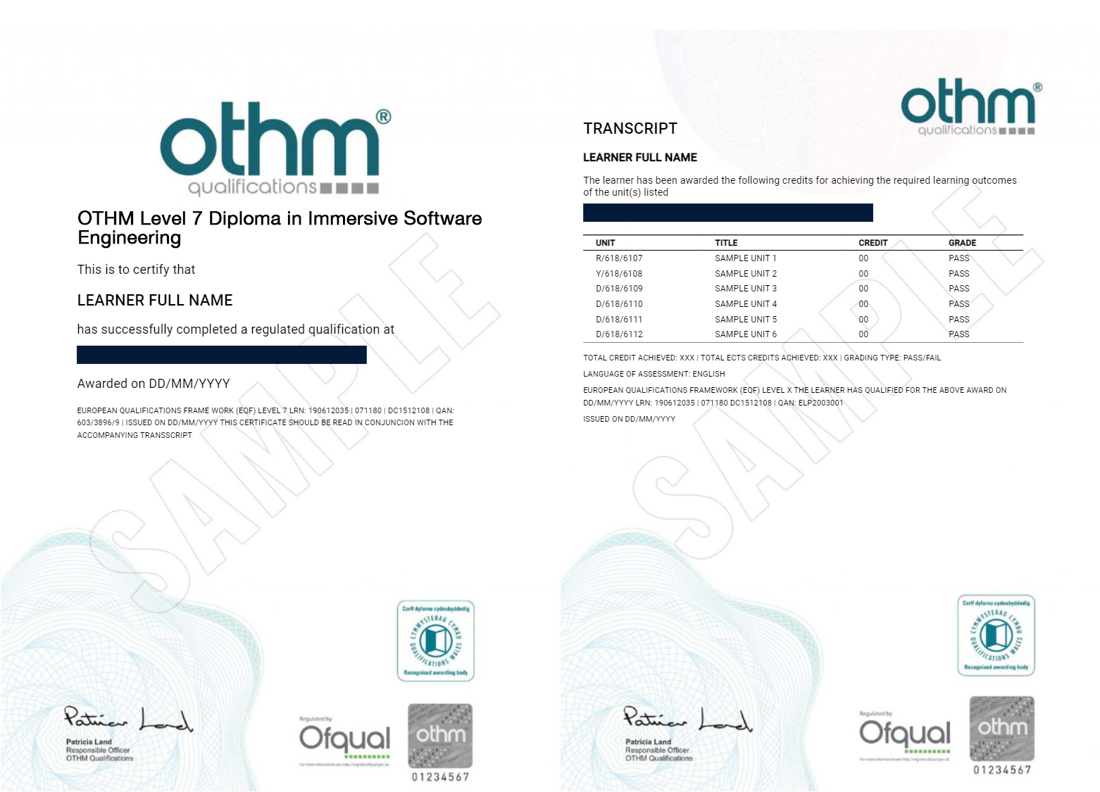 The OTHM Level 7 Diploma in Immersive Software Engineering qualification consists of 5 mandatory units for a combined total of 120 credits, 1200 hours of Total Qualification Time (TQT) and 480 Guided Learning Hours (GLH) for the completed qualification.