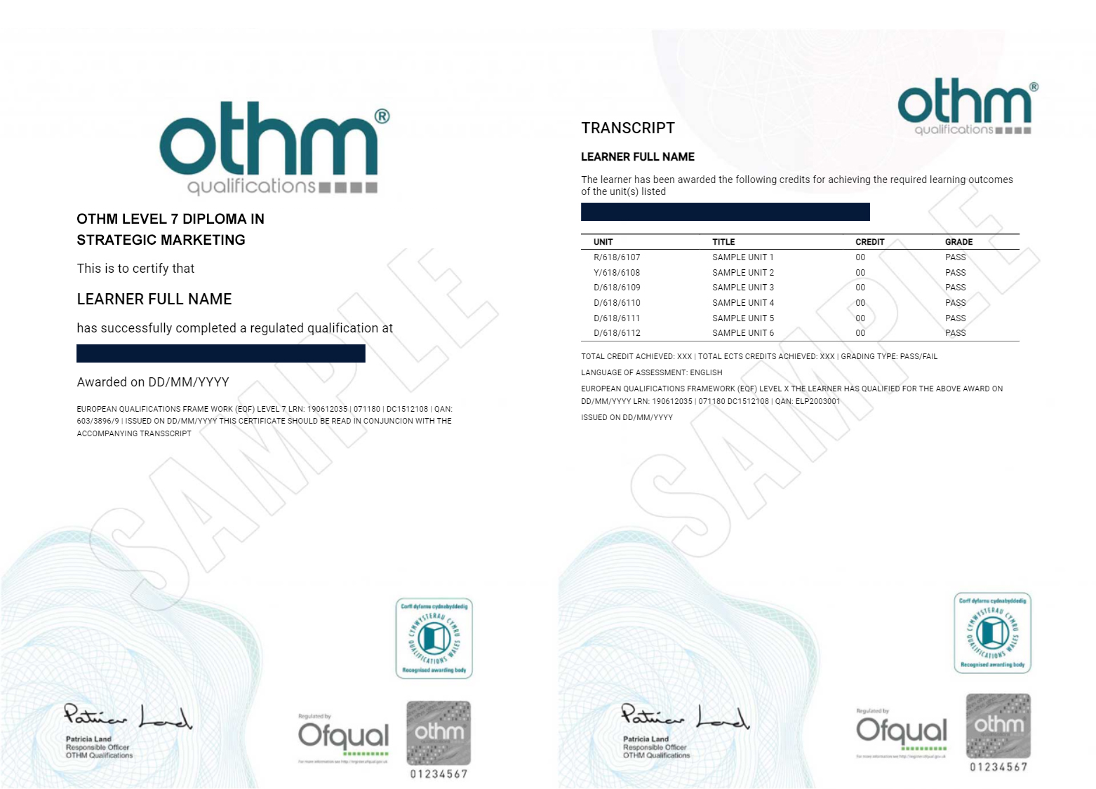 The OTHM Level 7 Diploma in Strategic Marketing qualification enables learners to progress into or within employment and/or to work toward a relevant master’s programme with advanced standing.